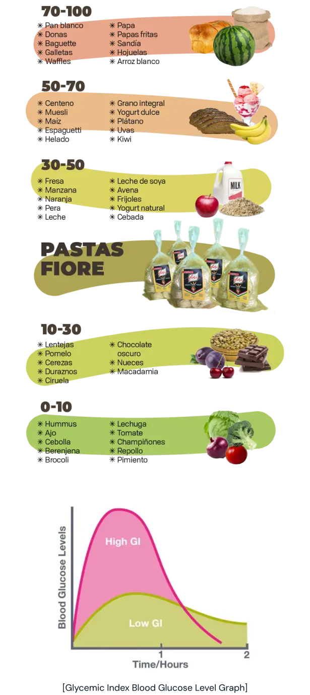 Adicionalmente es muy importante recalcar que la pasta “al dente”, es decir pasta que ha sido cocida antes gelatinizarse, presenta siempre índice glucemico más bajo que las demás.